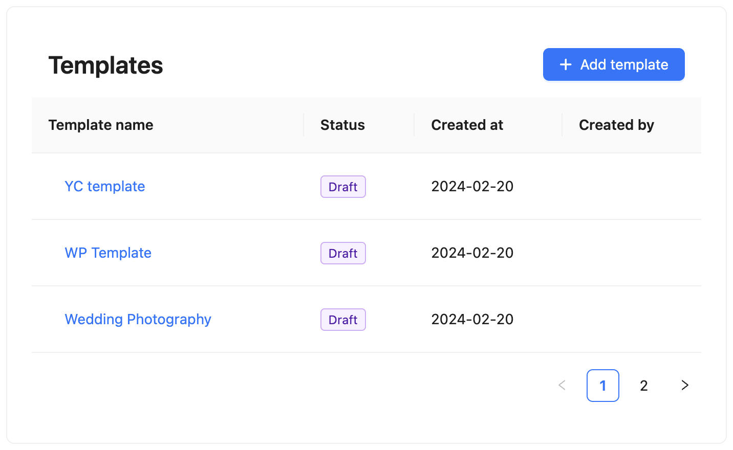 isModal | boolean | true | If false, every click on the table row will save the templateKey to local storage. If true, a click on the table row will open a modal window with the template rendered. |