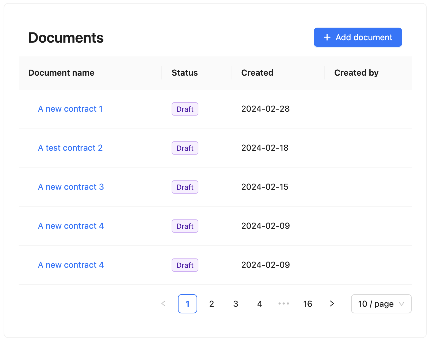 Now that you have a Client key for each of your clients, you can allow them to create new documents, send them for signing, and much more. There are multiple ways to enable your users to create documents. The easiest way to do this is to add a Contract List component to your interface. Learn how to use Sendforsign Components here. Once the component is added and the Client key is populated, your clients will see all the documents they have created and will have the ability to create new ones directly from this component.