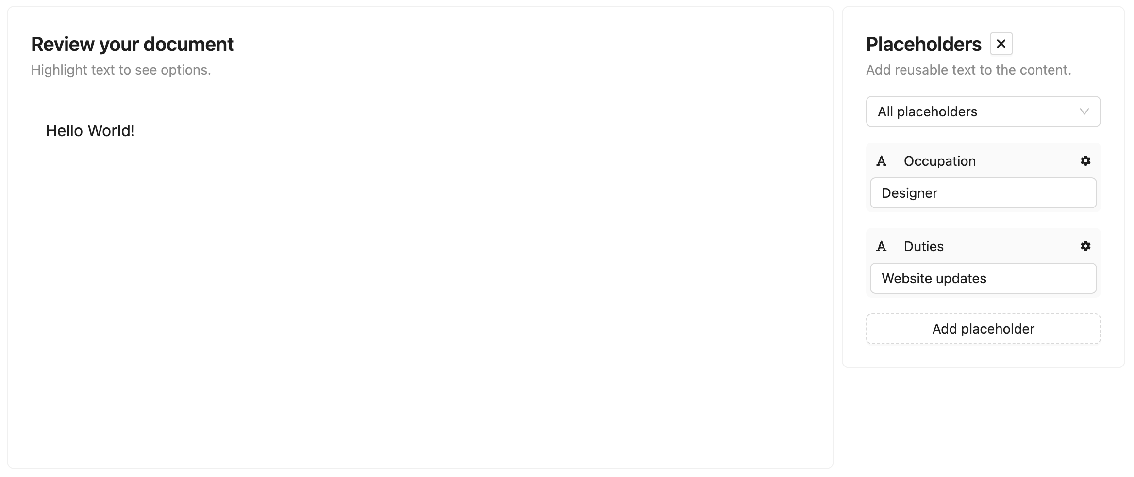 - If a user uploads a Word/PDF file or creates a document from scratch, the placeholders will remain untouched.